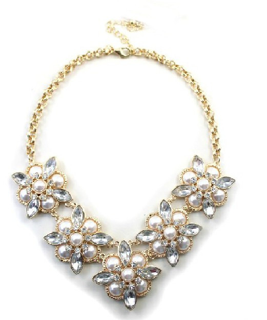 Gorgeous faux pearl bib necklace! Goldtone metal allow.