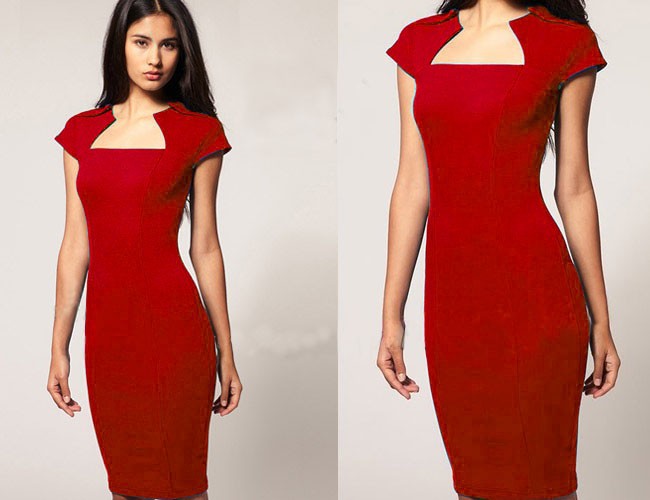 Professional Square Neck Bodycon Pencil Dress - Red