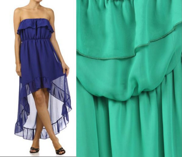 Solid strapless A-line dress with a ruffled neckline and hi-lo hem.